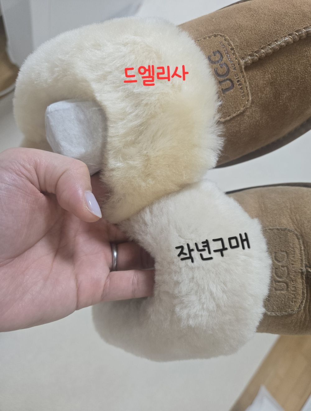정품이 맞는건지.. 작년에 산 어그 양모와 다르네요 털이 가짜같애요 ㅠㅠ 드엘리사믿고 산건데.. 실망이에요
